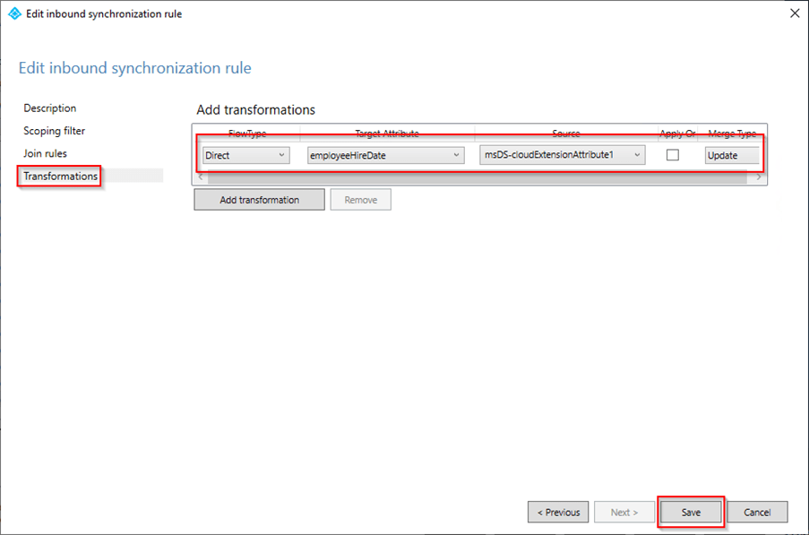 - Source: {the source attribute which you are going to use in AD for the EmployeeHireDate, e.g. extensionAttribute14 or msDS-CloudExtensionAttribute2}