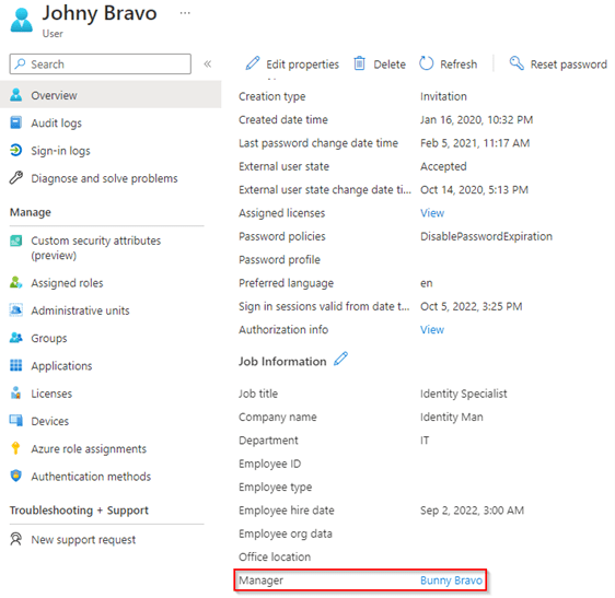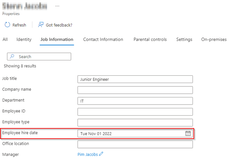 Now that we have configured the tenant settings, let’s make sure the properties on accounts are configured correctly. Let’s start with a simple value which is the manager value, this value needs to be populated correctly in Azure AD for workflows to trigger correctly. If this is not filled on user accounts some steps will fail (e.g. sending an email to the manager of the user). Because of that the workflow will fail, so please do make sure these values are populated correctly.