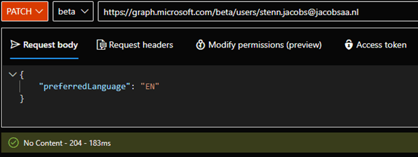 The second value is the PreferredLanguage value, as discussed in step 1, this value will determine the language of emails and has the highest preference on the user object level, the more you are populating this value the better it will be for your end users. For cloud only users this can be configured via the Graph API with the following API Call: