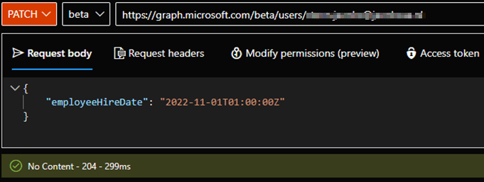 Another way we can set the EmployeeHireDate for cloud only accounts is via the Microsoft Graph API, if you want to do this you can use the following API call, whereby you can customize the actual time:
