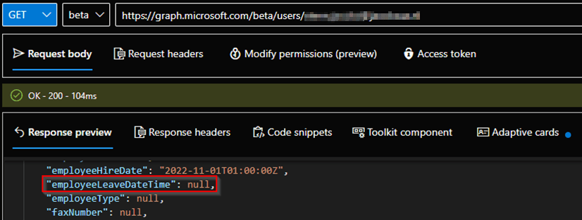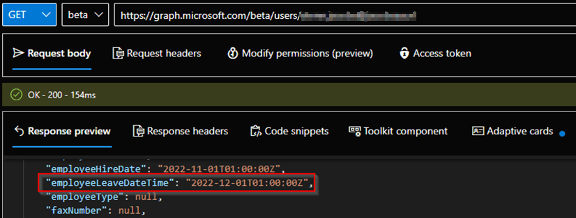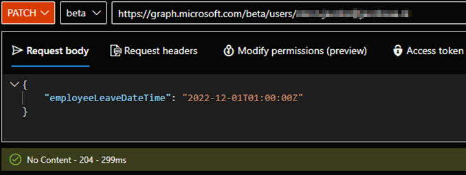 NOTE: To be able to read and write the EmployeeLeaveDateTime you need to have User-LifeCycleInfo.ReadWrite.All or Directory.AccessAsUser.All permissions. This is done to protect sensitive data from being exposed to the organization, you don’t want to cause panic or see that your contract is being ended before actually being informed.