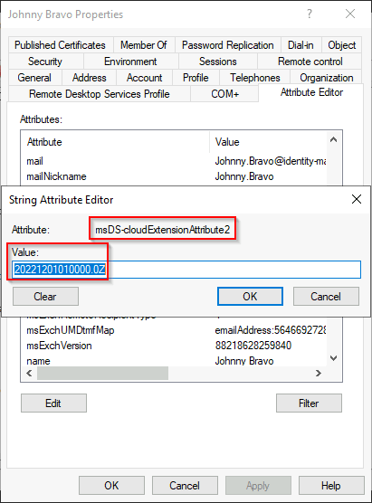 For users who are synced we can set this value as well, for this you need to use the attribute in the Active Directory which you picked as the source attribute for your EmployeeLeaveDateTime (as explained in step 2). In my case this is msDS-cloudExtensionAttribute2 synced with Azure AD Connect. In here I’ve entered the value ‘20221201010000.0Z’ which will result in a EmployeeHireDate of ‘Dec 1, 2022, 2:00 AM’ on the Azure AD portal.