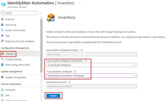 Once you’re in the ‘Automation Account’ go to ‘Inventory’, in here we need to make sure that a Log Analytics Workspace is connected to the Automation Account. If you haven’t deployed one yet, first make sure you have one (this to prevent a Log Analytics space from being created with a scrambled name, as renaming afterwards isn’t possible).