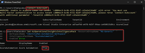 Once this is enabled, we need to make sure the Azure Automation solution in the Log Analytics Workspace is enabled. To do this let’s connect via PowerShell and enable the solution with the PowerShell commands below: