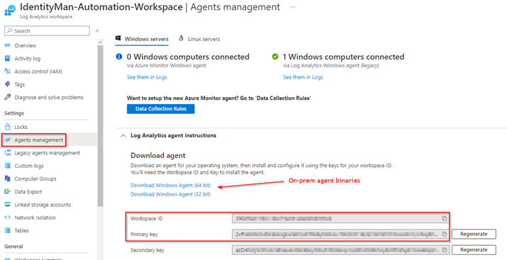 For this the first step is to go to the Azure Portal and go to the ‘Log Analytics Workspace’ configured earlier. In here click on ‘Agents management’ and make sure to copy the ‘Workspace ID’ and ‘primary key’.