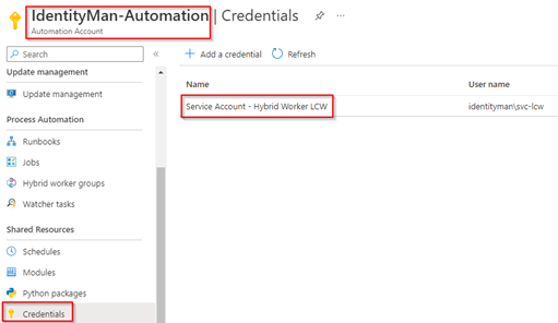 Now the hybrid worker is up and running, the last step is to make sure that we can execute runbooks on the hybrid worker with a ‘run as account’, this becomes very handy when we need to have permissions to execute write, update or delete actions in Active Directory. For this configure the credential of a service account (with permissions) which exists in your on-premises Active Directory beneath the ‘Credentials’ option of the ‘Automation Account’ (this service account doesn’t need to be synchronized to Azure AD).