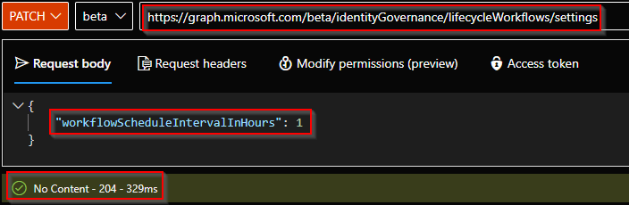 You should receive a callback which says ‘No Content – 204’ which means the change has been executed successfully. Going back to the UI of Lifecycle Workflows it will show us as well that this value has been changed.