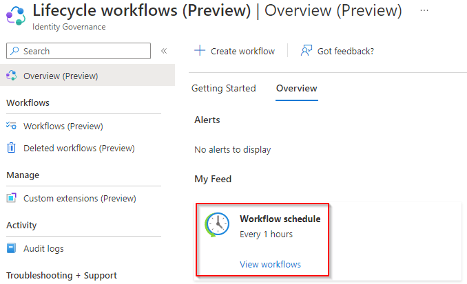 Let’s first start with some global tenant settings, starting with the schedule interval in which Lifecycle Workflows run. By default, this is set to 3 hours as you can see from the UI when going to Azure Active Directory –> Identity Governance –> Lifecycle Workflows.
