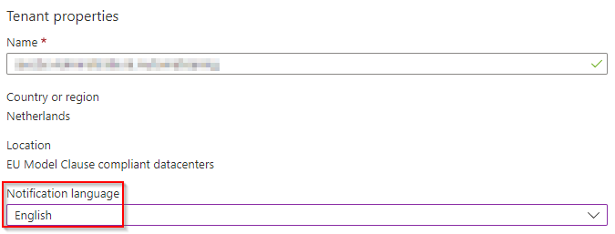 Now to configure this setting on the tenant level go to Azure Active Directory –> Properties. In here make sure the ‘Notification Language’ is set to the value which you want to have as a tenant setting, in my example below I’ve chosen for English.