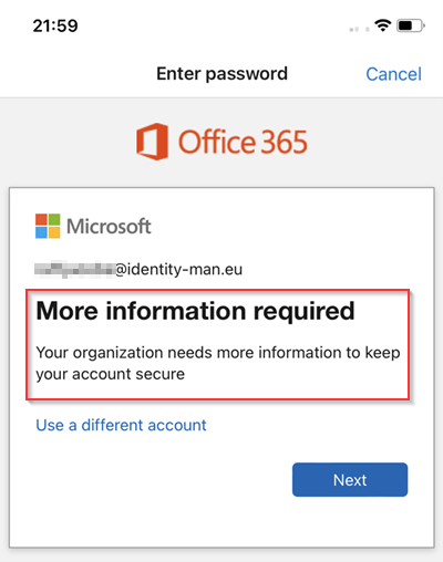Once the configuration is in place, let’s look at the user behavior, for that we need to go to the Outlook App on iOS or Android. If you connect a new email account within the Outlook App the below message will appear (unfortunately today this is just informational and doesn’t guide your users through the steps).