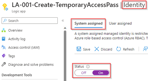 After you’ve created the access package and custom extension it’s time to fully prepare the logic app. The first step in this process is to go to the logic app, hit ‘Identity’ and on ‘System assigned’ toggle the switch to ‘On’ and hit ‘Save’. This will make sure the Logic App has a system assigned Managed Identity which we can provide permissions.