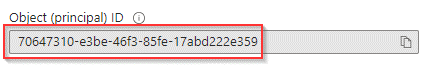 Once this is saved the ‘ObjectID’ of the Managed Identity (service principal) is shown, please note this down.