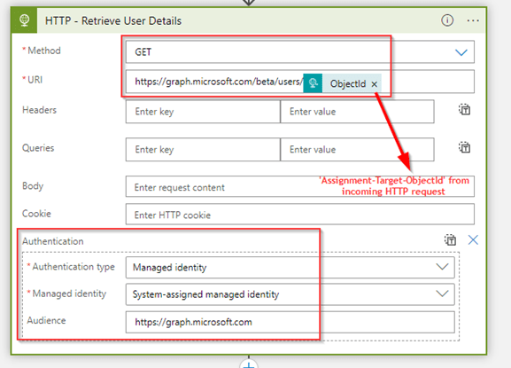 Select ‘HTTP’ as the connector, select ‘GET’ as method and use ‘https://graph.microsoft.com/beta/users/ObjectId’ as the URI. Once ready make sure that under ‘Authentication’ the ‘Managed identity’ is selected with the audience ‘https://graph.microsoft.com’.