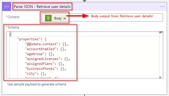 In the next step, make sure to parse the results of the output from the previous step ‘Retrieve User Details’, in my case I decided to match the schema to make sure all properties do exist and with that these are easy to select later within the logic app.