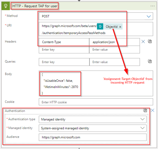 After this step it’s time to create a Temporary Access Pass, for that add another ‘HTTP’ action with ‘POST’ as method and with ‘https://graph.microsoft.com/beta/users/ObjectId/authentication/temporaryAccessPassMethods’ as the URI. Next make sure that within the headers the ‘Content-Type’ is set to ‘application/json’ and use the text below as body: