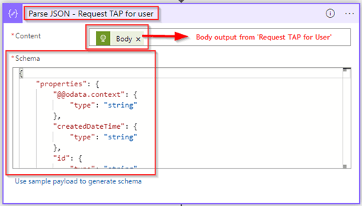 In the next step, we again make sure to parse the results of the output from the previous step ‘Request TAP for user’. Again, here I’ve made sure that the response should match the schema defined in the ‘Schema’ section.