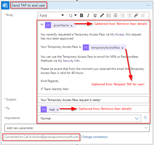 Now the user details are retrieved, and the TAP is generated let’s make sure that these details are send out to the end user with the ‘Send Email’ task within logic apps. As you can see, I’ve built the body of te email based on several attributes from the user which I gathered in earlier steps in the logic app, with that it will send out the email with the desired body text to the end user via email. You can of course choose to use a different method (i.e. SMS) to send the Temporary Access Pass to the end user, this is just an example.