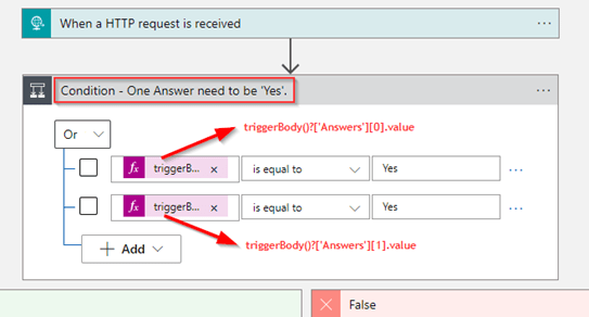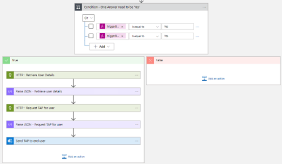 So, what we want to do in this case is, if either of the answers ‘Do you need a temporary Access Pass to bootstrap MFA?’ OR ‘Do you need a temporary Access Pass to bootstrap Passwordless?’ are set to ‘Yes’. We want to let the Logic App execute steps, if not it shouldn’t do anything, this can easily be configured with the ‘Condition’ shown below, in which I’ve filtered on the first two values in the array, whereby one of them should be set to ‘Yes’.