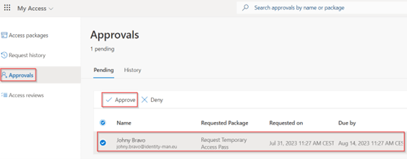 Once done the manager of Johny.Bravo@identity-man.eu will receive an email with an access package request to approve, when the user goes to the MyAccess portal and hits ‘Approvals’ on the left hand side, the pending approval for ‘Johny Bravo’ pops up and is ready to be approved.