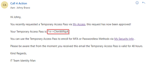 If one of the results for the conditions is ‘True’ the user will be gathered, the Temporary Access Pass will be created and the user will receive an email, this as shown below.