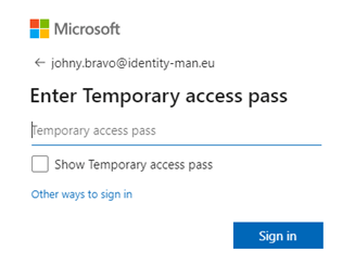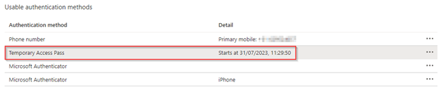 Beneath the user account in Microsoft Entra ID we can also see that the Temporary Access Pass has been added under the usable authentication methods.