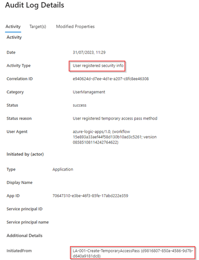 And within the ‘Audit Logs’ we can see that the Temporary Access pass method has been added by the Logic App which was triggered, in our case LA-001-Create-TemporaryAccessPass.