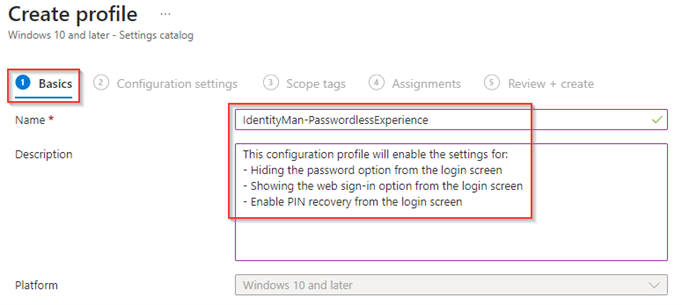 In the ‘Basics’ screen, give the Configuration Profile a ‘Name’ and ‘Description’.