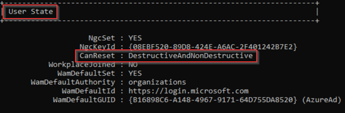 Once you’ve verified both applications are available within the ‘Enterprise Applications’ overview, let’s verify if Windows 11 has recognized you can reset your PIN. Therefore, sign-in to Windows 11, open a command prompt and run the cmdlet ‘dsregcmd.exe /status’. Beneath the ‘User State’ verify the ‘CanReset’ is reporting ‘DestructiveAndNonDestructive’.