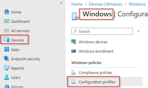 To enable the ‘Passwordless experience’ and ‘Web Sign-in’ feature for Windows 11, go to the Intune Admin portal, click on ‘Devices’, click on ‘Windows’ and hit ‘Configuration Profiles’.