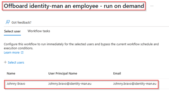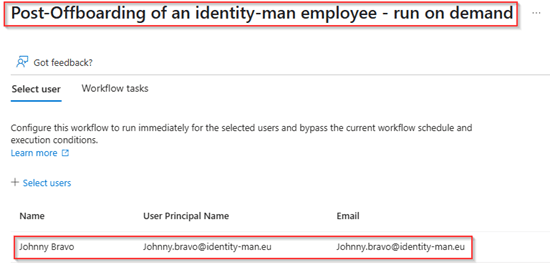 Now the users are disabled, let’s also test the Post-Offboarding with a ‘Run on demand’ flow. This flow will delete both the user account and admin account of the user account. Once the user is selected hit ‘Run Workflow’.
