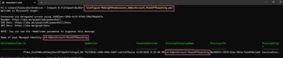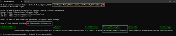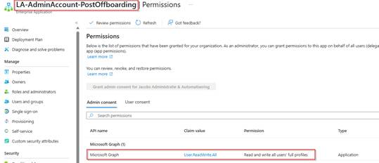 | LA-AdminAccount-PostOffboarding | User.ReadWrite.All | Privileged Authentication Administrator | Graph Permission Script Post Offboarding GitHub |