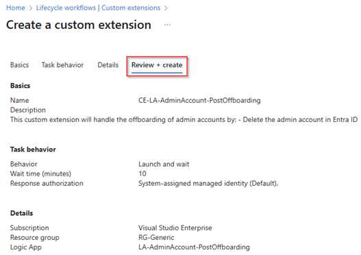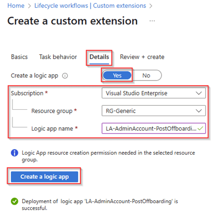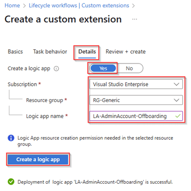 Within the details screen we create a separate Logic App with the name ‘LA-AdminAccount-PostOffboarding’ for Post Offboarding activities which is associated to this custom extension. Once ready again hit ‘Create a logic app’.