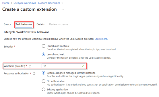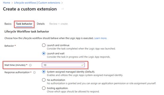 Also, here within the task behavior we select to ‘launch and wait’ and have configured it to ‘10 minutes’ for the Logic App to provide a response back to Entra Lifecycle Workflows.