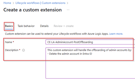 Fill in the ‘Basics’ information for the custom extension, in this case a name and description. For me it’s helpful to reuse the name of the custom extension within the name of the Logic App so I know they belong to each other. The custom extension created in the next few steps will disable the admin accounts during the offboarding process.