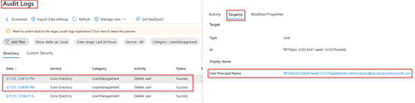 In the audit logs of Microsoft Entra, we can see that both users are being deleted (with a soft delete).