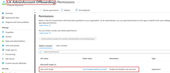 | LA-AdminAccount-Offboarding | User.EnableDisableAccount.All | Privileged Authentication Administrator | Graph Permission script Offboarding GitHub |