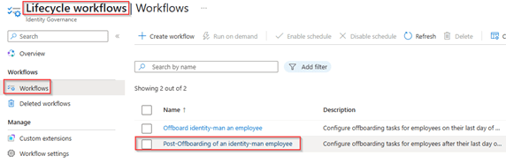 Now the custom extension and logic apps have been fully configured we can add them to actual workflows within Lifecyle Workflows. For this go to the Entra Admin portal, go to Lifecycle Workflows, hit Workflows and select the ‘Offboard an employee flow’ in this case this flow was already available and also contains the step to disable the regular user account of the user.