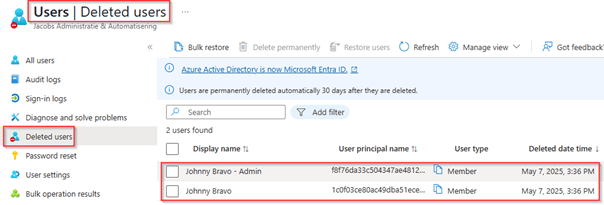 At this point the admin accounts will automatically be disabled (offboarded) and deleted (post offboarded) together with the end user accounts. So, let’s test the behavior of the created lifecycle workflows.