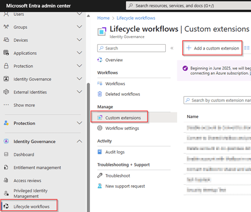 To be able to disable and delete admin accounts associated to the end user account we need to use custom extensions in Entra Lifecycle Workflows. For this go to the Entra Admin portal, go to Lifecycle Workflows, select Custom Extensions and hit ‘+ Add a custom extension’.