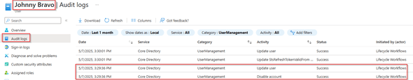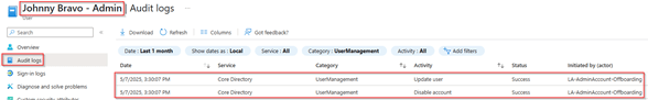 With this ‘Run on demand’ flow the regular user account of the user will be disabled and the admin account as well. This can also be found within the audit logs of both accounts, in here you can see that the regular user account is being disabled by Lifecycle Workflows.