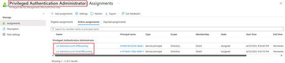 The last step is to add the ‘Privileged Authentication Administrator’ role to the system-assigned managed identities. This permission needs to be an active assignment which doesn’t expire and provides permissions to disable and delete privileged accounts (like global administrators) together with the desired graph permission (as these go hand in hand).