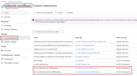 As the above custom extension will only disable the admin accounts, we need a separate custom extension and logic app to delete the admin account. For that we have created a separate custom extension called ‘Post Offboarding‘ which will execute the deletion of the admin account.
