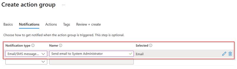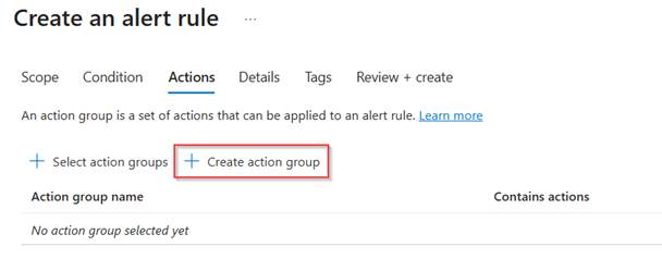 Now within the ‘Actions’ we configure what should be done when an alert is being triggered. If you already defined action groups here these can be re-used. For me this is not the case so let’s select ‘Create action group’.