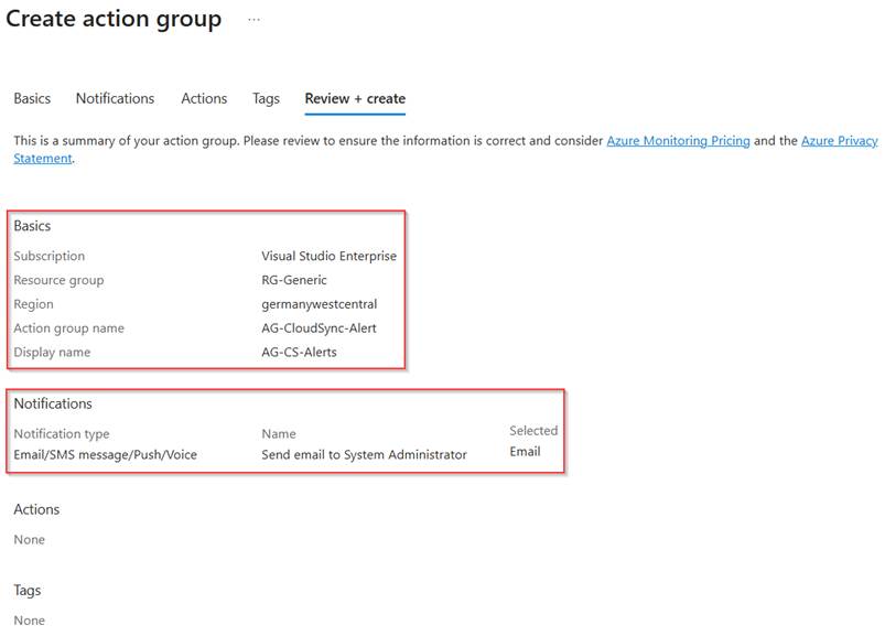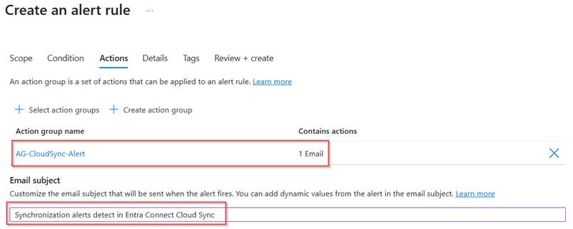 Now the action group is created and selected within the Alert Rule, we can provide a user friendly ‘Email subject’. For this I’ve used ‘Synchronization alert(s) detected in Entra Connect Cloud Sync’. Once you’re happy with the action group configuration, hit ‘Next’.