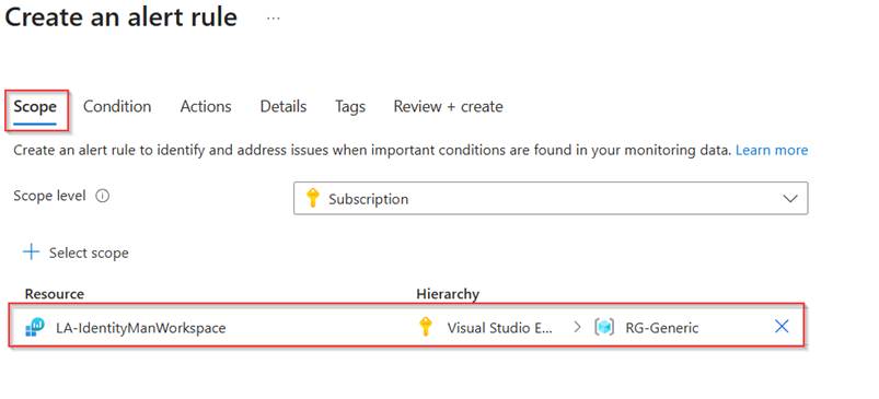 The next step is to configure an alert rule in Azure Monitor. For that go to the Azure admin portal and go to Azure Monitor. In here hit ‘Alerts’ and click ‘Create Alert rule’. In the pane which opens, make sure within the scope the same log analytics workspace is used for which we have configured the diagnostic settings. Once ready hit ‘Next’.