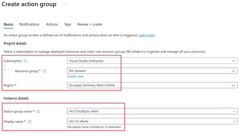 Now choose in which region and which subscription this Alert rule needs to be created and give the action group a ‘Name’ and ‘Display Name’. Hit ‘Next’ when ready.