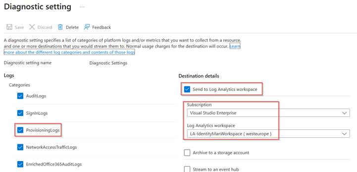 In the diagnostic setting, make sure that ‘Provisioning Logs’ are ‘Send to Log Analytics workspace’ and select the subscription and log analytics workspace you want to use. Once ready hit ‘Save’.