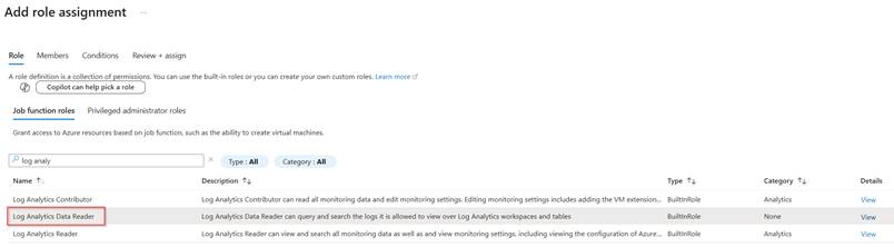 Search for the ‘Log Analytics Data Reader’ role which is the default role with bare minimum permissions for the alert rule to function, once ready hit ‘Next’.