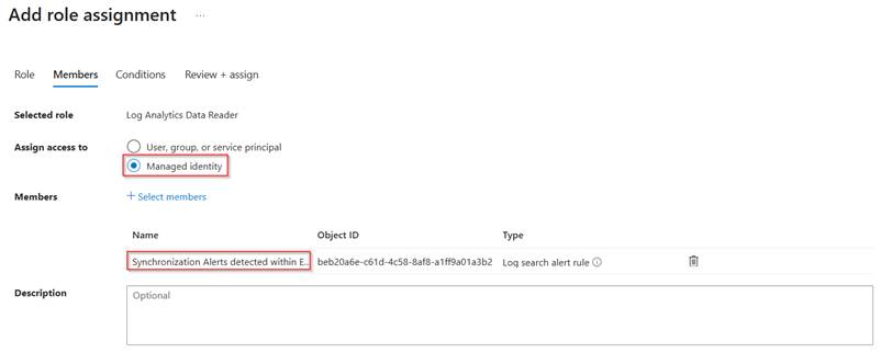 In the members section add the ‘Managed Identity’ of the ‘Alert rule’ which has been created during the creation of the alert rule. Once ready, go to the ‘Review + assign’ step and once you’re happy hit ‘Review + Assign’.