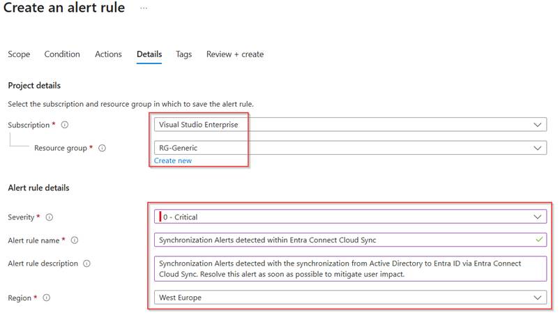 Now it’s time to configure the last part of the alert rule, which is the subscription and resource group in which the alert rule will be created and with that also the ‘Severity’, ‘Alert rule name’, ‘Alert rule description’ and ‘Region’.